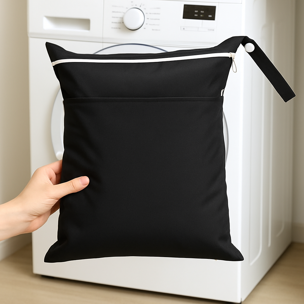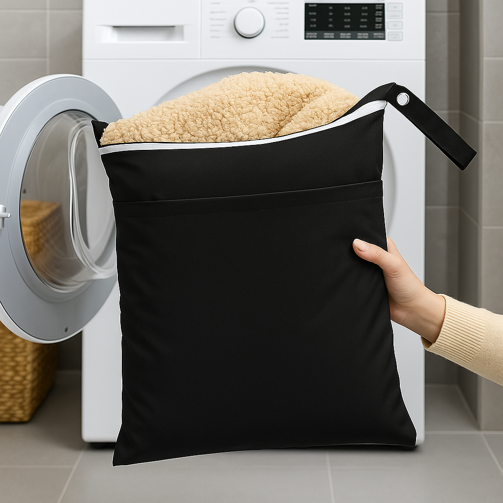 Mit dem wasserfesten Beutel lassen sich Hundedecken und Zubehör sauber in der Waschmaschine reinigen – ganz ohne Tierhaare im Gerät.
